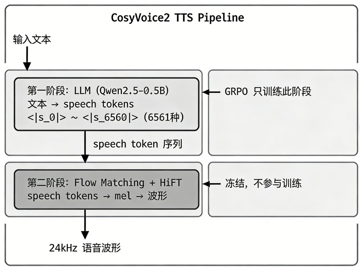 理解 GRPO 训练,首先需要了解 CosyVoice2 的两阶段 TTS 架构: