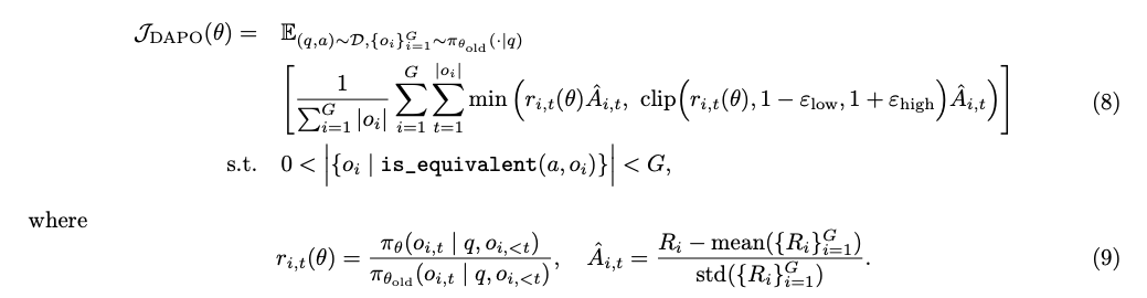 - 动态采样机制:过滤 “全对 / 全错” 无效样本,保留有效梯度样本,提升训练效率。