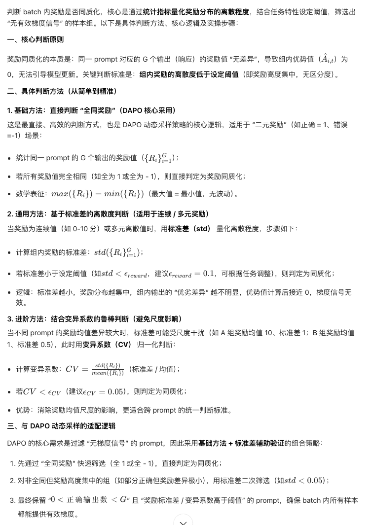 - 问题一:如何判断 batch 内的奖励是同质化的呢?