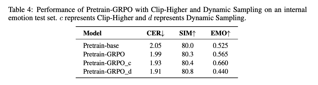 将 GRPO(Group Relative Policy Optimization)范式应用于 TTS,解决传统 RL 的 reward hacking 和训练不稳定问题。这些强化学习的策略,在预训练和 SFT 都证明是有效的,能够提高发音准确度、音色相似度和整体自然度: