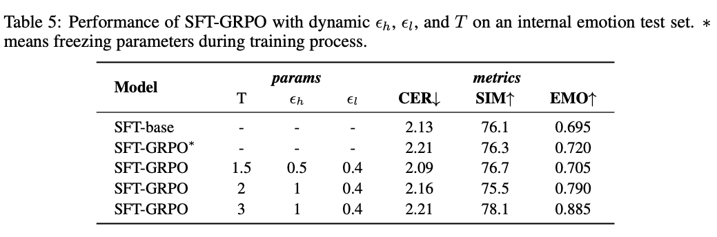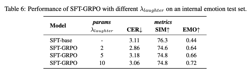 - 【奖励函数】融合四大核心奖励函数:CER(发音准确率)、SIM(音色相似度)、Emotion(情感自然度)、Laughter(笑声副语言真实度)