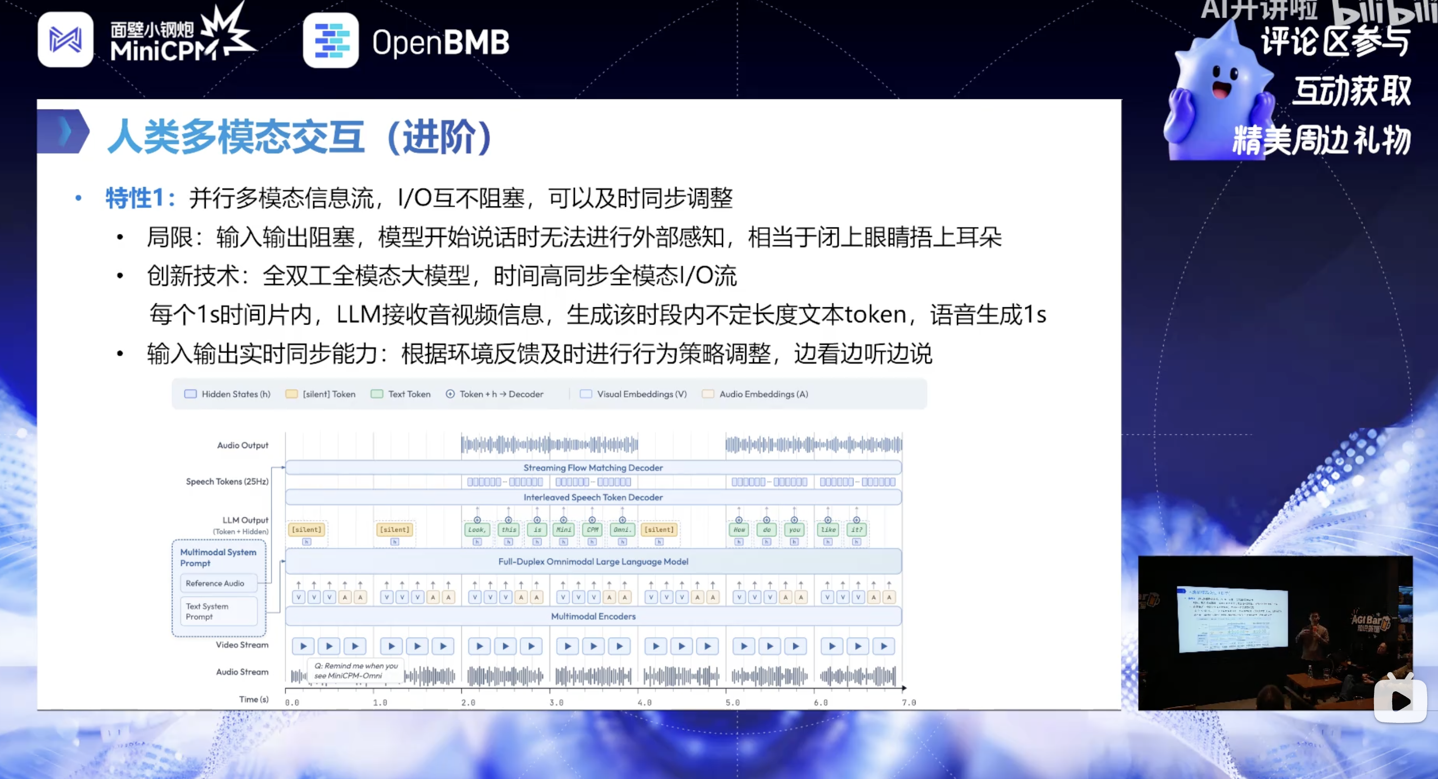- I/O 互相不阻塞的核心是时分复用,时间概念为核心:输入输出在时间上严格绑定,实现几十 ms 粒度对齐;1s 时间内,LLM 输入切片后的视频和语音信息,输出不定长文本 Token + 固定长度语音 token,避免文本 token 生成过快造成浪费。
