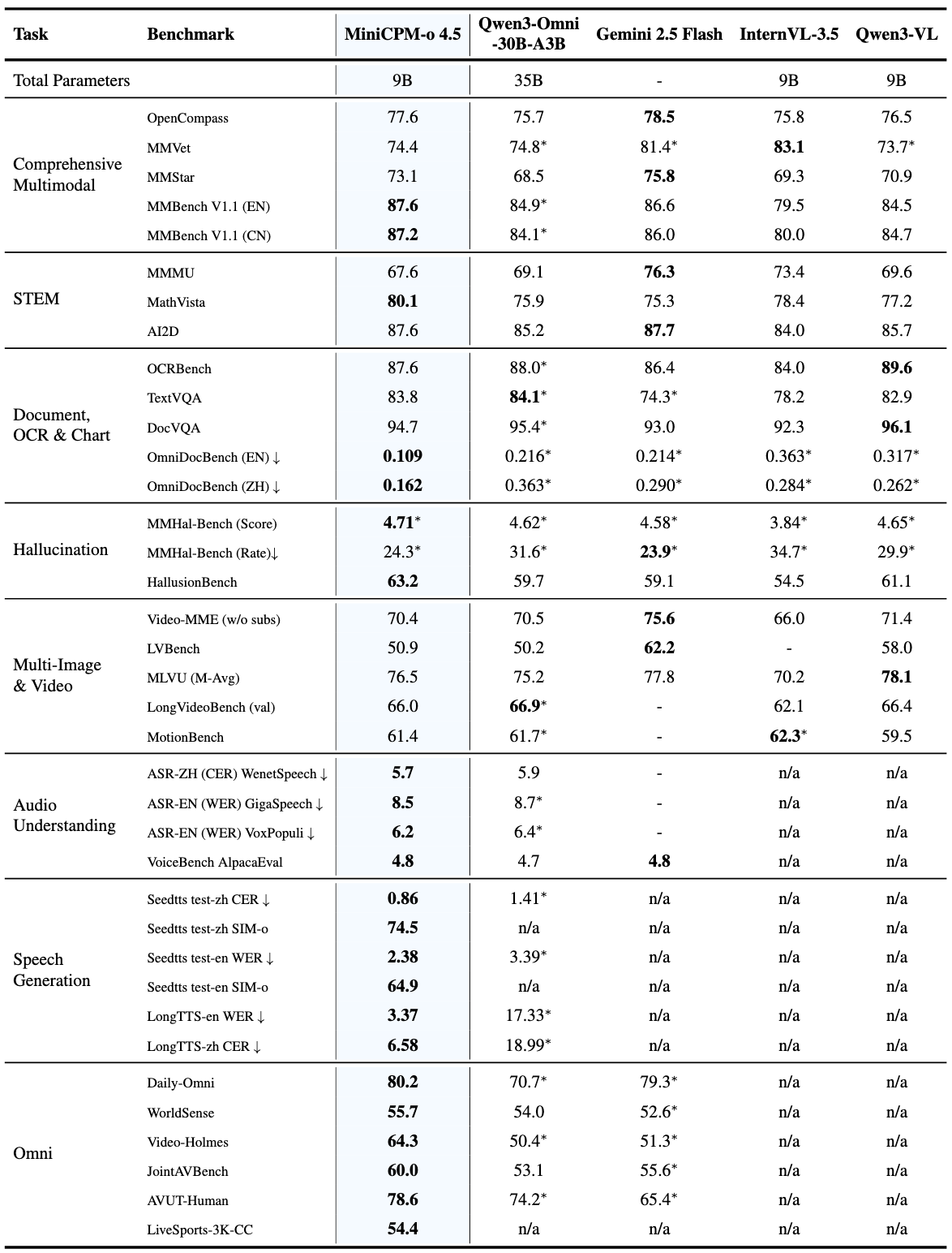在 8B/9B 参数量下,各模态能力均实现同尺寸领先,核心包括: